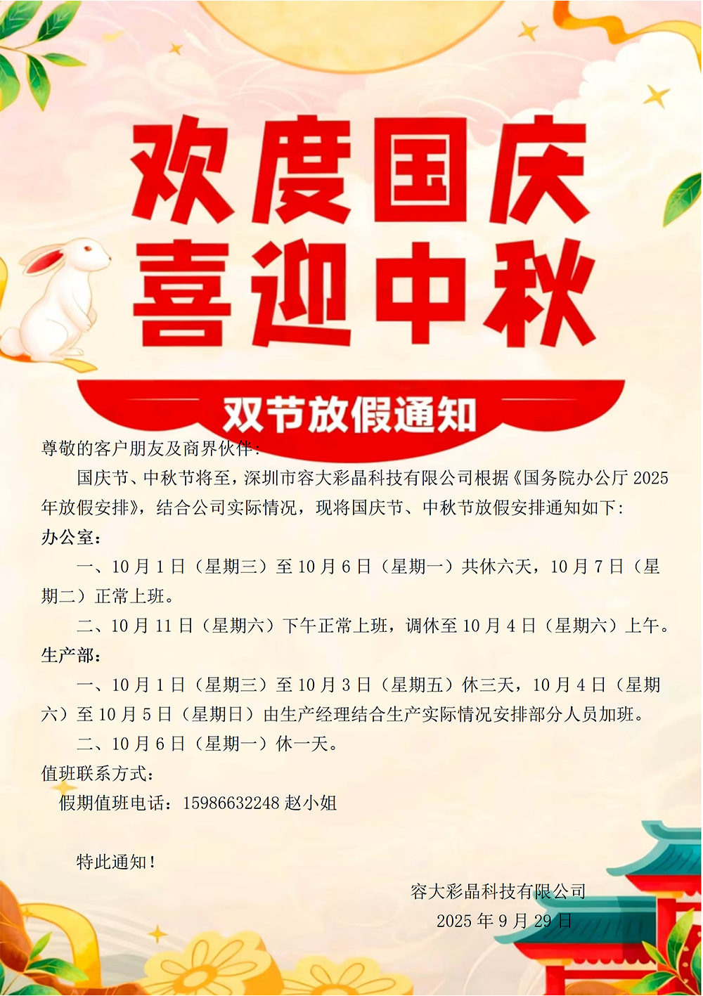 容大彩晶中秋國(guó)慶放假通知